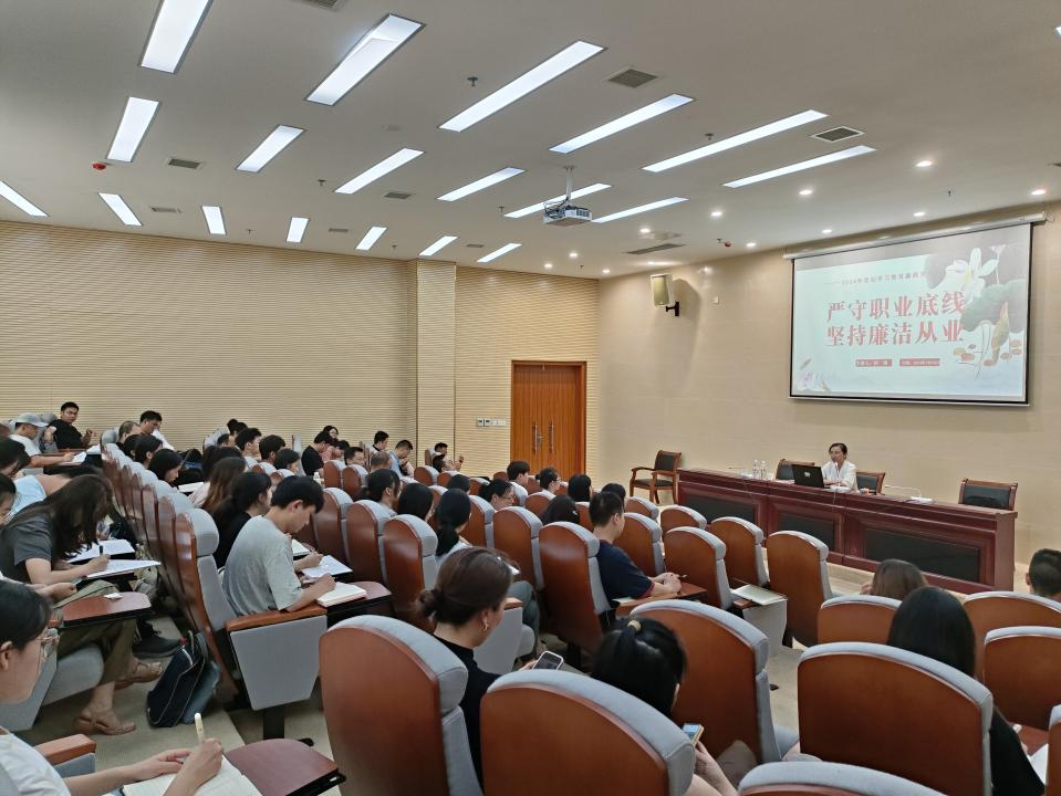根据公司党纪学习教育部署,为进一步加强党性修养,筑牢教师廉洁自律和拒腐防变思想防线,增强教师廉洁意识,7月10日下午,公司党委书记何璘教授在伟德国际victor1946南校区行政楼第一报告厅为公司全体党员师生讲授题为《严守职业底线坚持廉洁从业》的廉政党课。