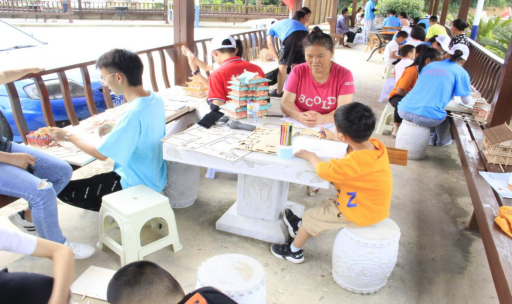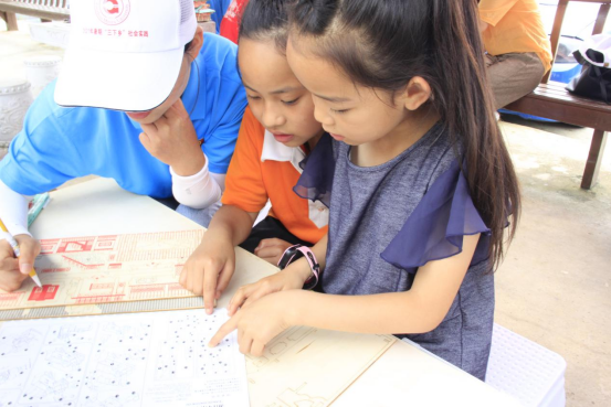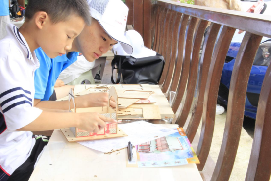 在志愿者们的耐心指导下,模型搭建得很顺利,通过志愿者们的讲解,孩子们对于中国建筑中的榫卯结构有了一定的了解,搭建的过程中也会不时提问志愿者一些专业问题,很快,在大家的共同配合下,岳阳楼、黄鹤楼、风雨桥,吊脚楼等模型一个个搭好了。
